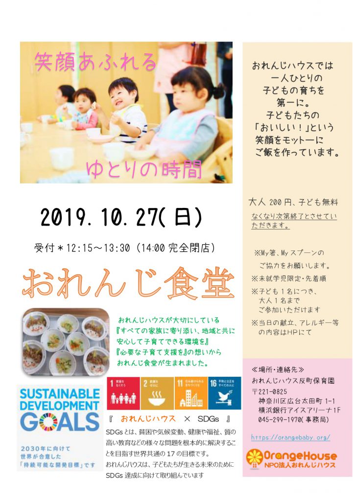 先日は、台風19号接近に伴い延期にさせていただいたおれんじ食堂。 前回楽しみにしてくださった方々のために開催が決定しました! ----------------- 日にち*10.27 (日) 受 付*12:15~13:30 (14:00 完全閉店) 料 金*大人 200 円、子ども無料 /未就学児限定・先着順 なくなり次第終了とさせていただきます。事前予約は不要です 場 所*おれんじハウス反町保育園(https://test.orangebaby.org/tammachi.php) ※My箸、My スプーンの ご協力をお願いします。 ※子ども 1 名につき、大人 1 名までご参加いただけます 。 ※アレルギーで心配のある方は、事前にご相談ください。 ----------------- ☆10.27(日)のメニューが決定☆ チキンカレー かぶのサラダ ポトフ フルーツポンチ