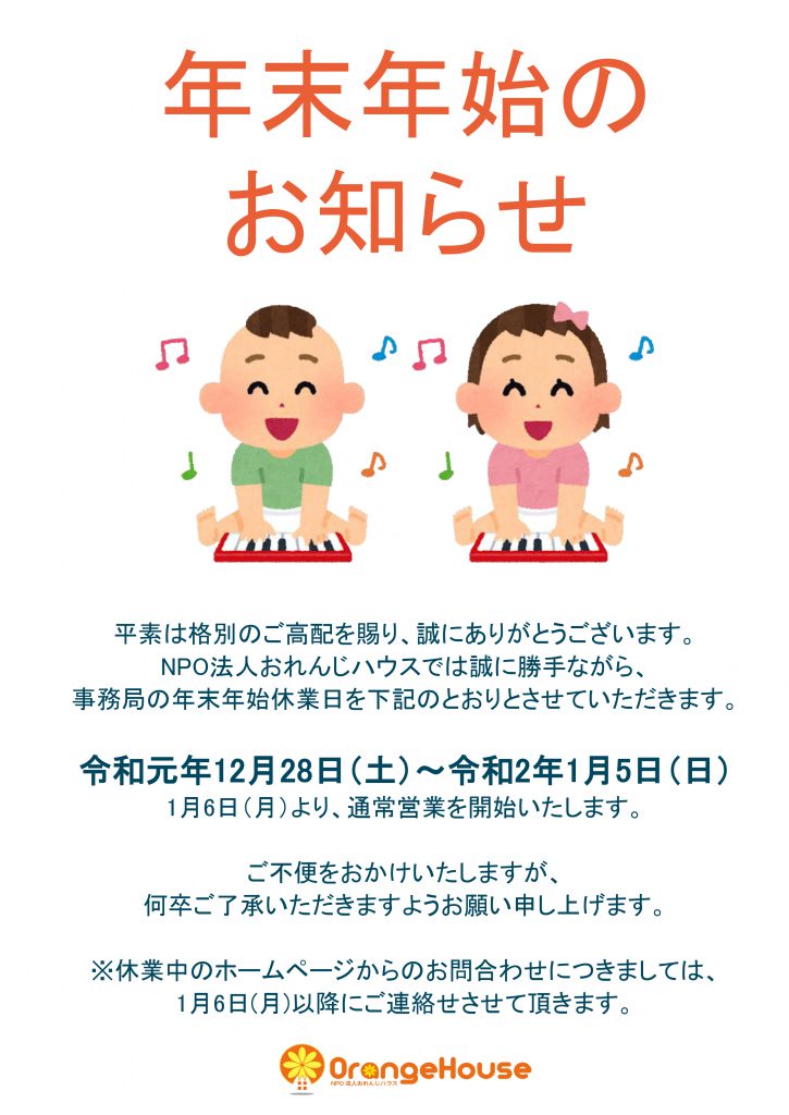 info 2019.12.18 【年末年始のお知らせ】 平素は格別のご高配を賜り、誠にありがとうございます。 NPO法人おれんじハウスでは誠に勝手ながら、 事務局の年末年始休業日を下記のとおりとさせていただきます。 令和元年12月28日(土)~令和2年1月5日(日) 1月6日(月)より、通常営業を開始いたします。 ご不便をおかけいたしますが、 何卒ご了承いただきますようお願い申し上げます。 ※休業中のホームページからのお問合わにつきましては、 1月6日(月)以降にご連絡せさせて頂きます。